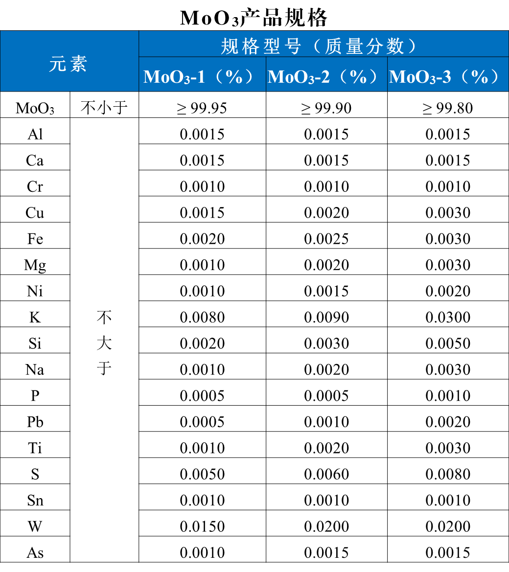 產(chǎn)品根據(jù)化學成分和用途不同,分為MoO3-1,MoO3-2,MoO3-3三個牌號。